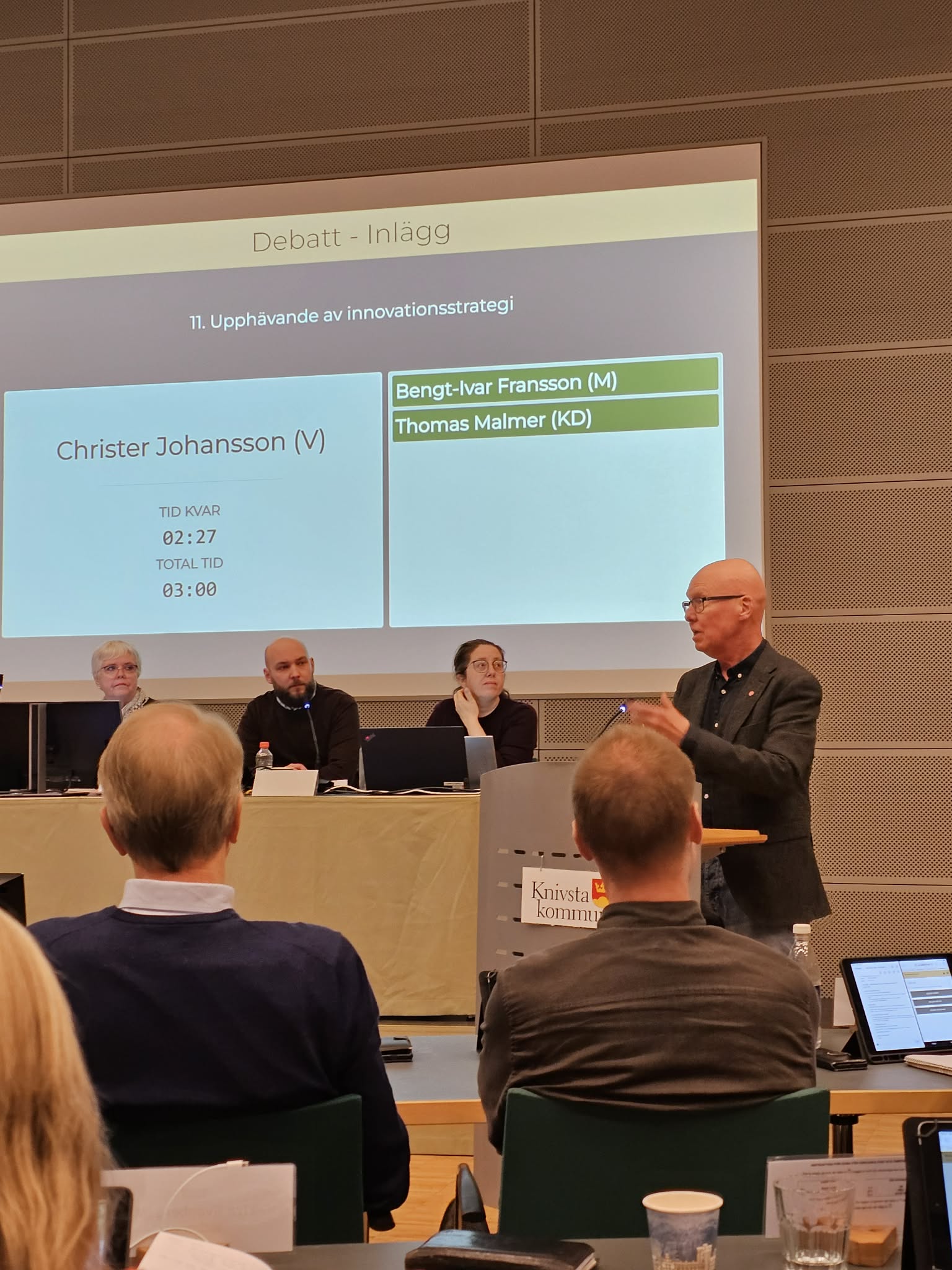 Said Hodzic (V) yrkar bifall till motionen och menar att kommunens koldioxidbudget och hållbarhetslöften är en bra början men det är ingen handlingsplan. Vänsterpartiet vill inte peka finger utan se en plan med tydliga mål och ansvar. Därefter kommer Björn-Ove Björk (KD) och menar att Sverige redan är ett av världens mest klimatsmarta länder och hänvisar till att Kina och Indien är problemen för den globala klimatkrisen. Jag upplyser härmed att Kinas utsläpp har planat ut och beräknas sjunka under 2025. Indien ligger under genomsnittet sett till utsläpp per capita och storsatsar på solkraft. De svenska utsläppen ökar medan Knivstas minskar, men för sakta för att nå målen.
