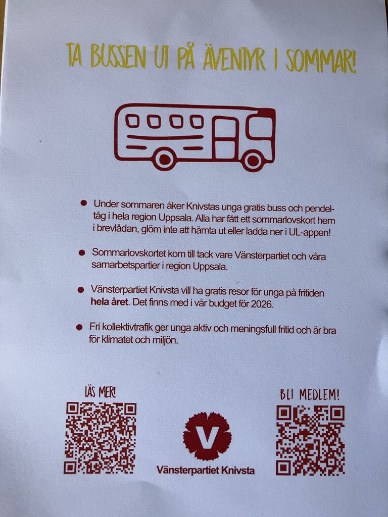 Avslutningsvis påminner vi om att du kan hjälpa några av världens 30 miljoner barn som är på flykt undan krig, klimatkatastrofer och våld. Följ länken till Knivstas insamlingsbössa poster världens barn 2025 och skicka in ditt bidrag. Vänsterpartiet sänder ett stort tack till de Knivstabor som startat denna bössa.